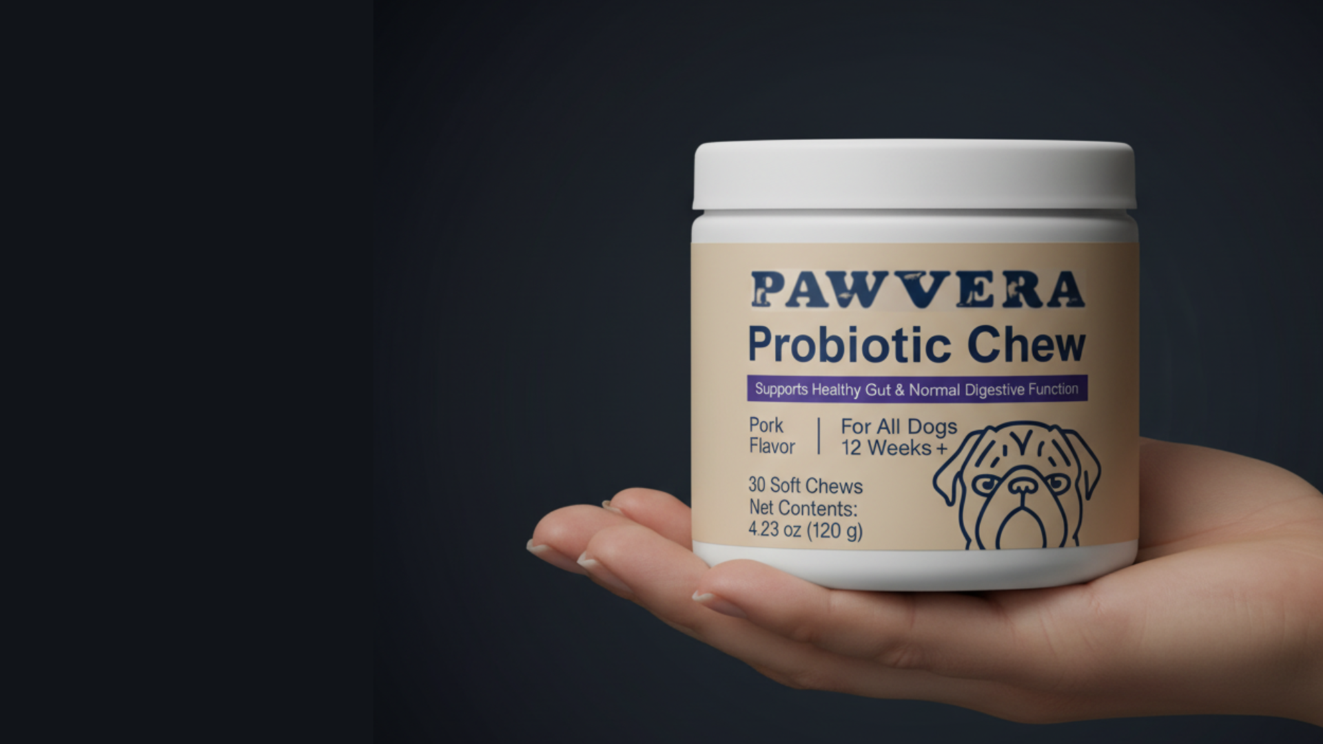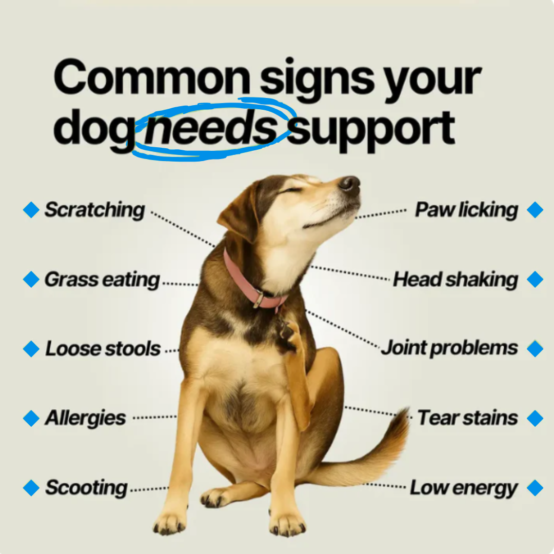 Our powerful blend of probiotics, prebiotics, and postbiotics supports your dog’s gut, skin, and immune health from the inside out. It helps maintain balanced digestion, reduces itching and sensitivities, strengthens the immune system, and promotes a healthy, shiny coat — so your pup looks and feels their best every day.