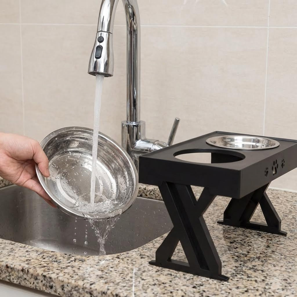 After feeding, lift out the bowls for quick rinsing or dishwasher cleaning. Wipe the stand if needed and it’s ready for the next meal.