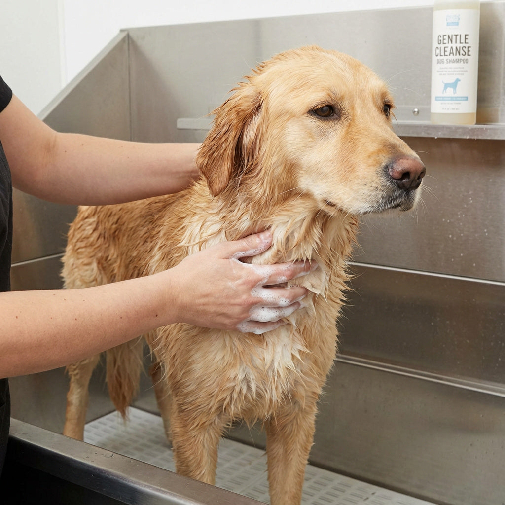 Work the shampoo into a light lather, focusing on areas that hold odour — such as paws, chest, belly, and behind the ears.